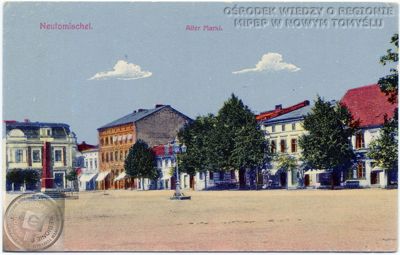 Pocztówka z Nowego Tomysla - obecny plac Chopina, 1909 r. Wyd. Richard Seeliger.Przedstawia widok na plac Chopina - dawniej, do 1918 r.- Alter Markt, później Stary Rynek.