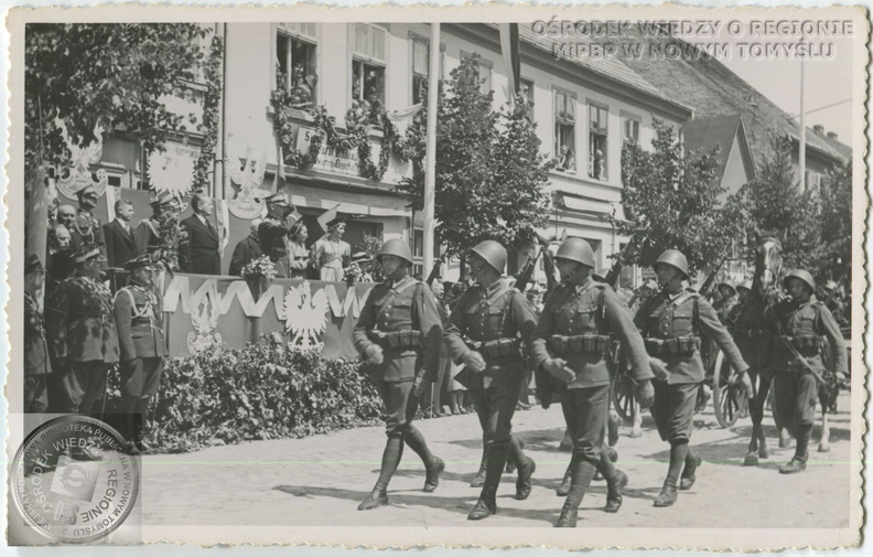 Trybuna honorowa podczas defilady, gdzie zajmował miejsce generał broni Kazimierz Sosnkowski, generał brygady Edmund Knoll-Kownacki, wojewoda poznański oraz starosta powiatu nowotomyskiego. Na lewo od trybuny widoczni oficerowie przybyli na tę uroczystość, a po prawej mieszkańcy powiatu.